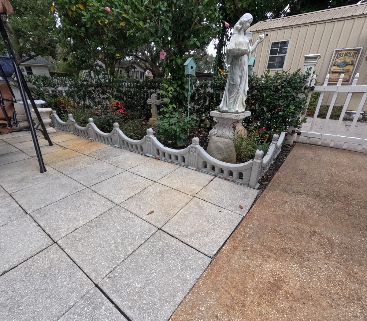 Regal Arch concrete fence panels installed as a decorative garden border around landscaping and statues.